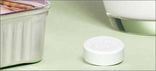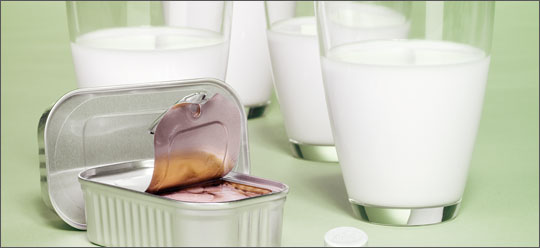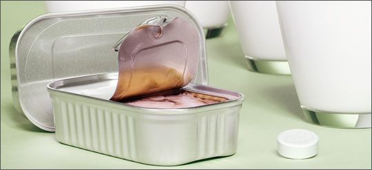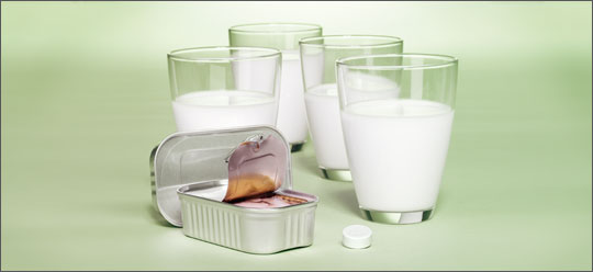 Das Foto zeigt mehrere GlĂ€ser Milch und Fischkonserven: das Quantum an Nahrungsmitteln, das man zu sich nehmen mĂÂŒsste, um die gleiche Menge Calcium aufzunehmen, die in einer Tablette Osteo Vital enthalten ist.