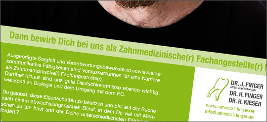FĂÂŒr die Zahnarztpraxis Dr. Finger haben wir diese Stellenanzeige entworfen und umgesetzt. Sie wurde zielgruppengerecht in einem Schulmagazin veröffentlicht.